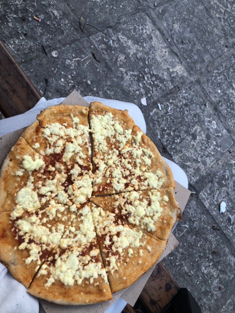 Nach meinem Mittagsschlaf hatten mich auch schon die ersten besorgten SMS-Nachrichten von Papa erreicht. War ja eigentlich klar, dass er sich als erstes meldet. Aber WLAN hatte ich immer noch keins. Vom Hunger getrieben machte ich mich wieder auf ins Chaos. Mit Erschrecken musste ich feststellen, dass keiner Englisch spricht. Und, naja, mit meinem Latein kam ich halt auch nicht weiter. Also bin ich erst mal los, um eine Bank zu suchen. Ich brauchte Bargeld. An der ersten Bank war ich so verwirrt über die meterlange Schlange vor dem Automaten, dass ich weitergegangen bin. Bei der zweiten Bank musste ich dann feststellen, dass es dort genau so war. Also stellte ich mich an. So richtig ernst nahm mich aber keiner in der Schlange. Es haben sich permanent Leute vor mich gestellt. Sogar ein Polizist hat sich vorgedrängelt! Irgendwie klappte die Sache mit dem Geld dann doch. Mit meinen ersten Pesos (1€ für 24 CUP) bewaffnet habe ich mich auf die Suche nach was zu Essen gemacht. Am liebsten vegan. Vegetarisch ginge auch. In der Fußgängerzone musste ich feststellen, dass Pizza anschient das mit Abstand beliebteste Gericht ist. Also bestellte ich eine Pizza. Die günstigste. Die wäre dann bestimmt nur mit Käse. Aber hier auch wieder: Die Menschen ignorierten mich einfach, da ich ja kein Spanisch spreche. Ich war total perplex. Sowas ist mir noch nie passiert. Als schließlich keiner mehr vor dem Laden stand, konnte die Verkäuferin nicht anders, als meine Bestellung aufzunehmen. Die Pizza schmeckte wie ein wabbeliger Karton! Aber egal, Hauptsache etwas im Bauch. Ich hoffte nur, dass sich diese kulinarische Erfahrung nicht über die ganze Insel fortsetzen würde und ich einfach nur am falschen Laden war. Sagen wir mal so, ich hatte mich da ziemlich getäuscht.