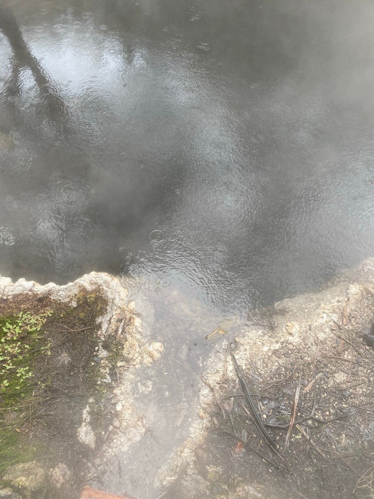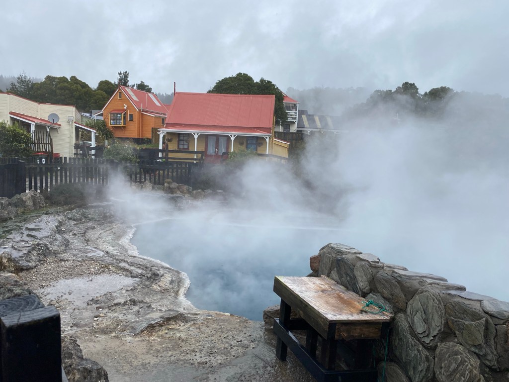 Im Thermalbad von Rotorua ruht man direkt am Seeufer in kleinen gefassten Quellen. Gegenüber spucken Geysire und Dämpfe steigen auf. Ein unwirkliches Szenario. Wir liegen bei 38 Grad, 41 Grad im warmen Wasser und schauen auf das Naturspektakel. Das Baden hier soll gegen Ischias, Rheuma und tausend andere Plagen helfen. Und es ist wunderbar entspannend. Sogar bei Regen!