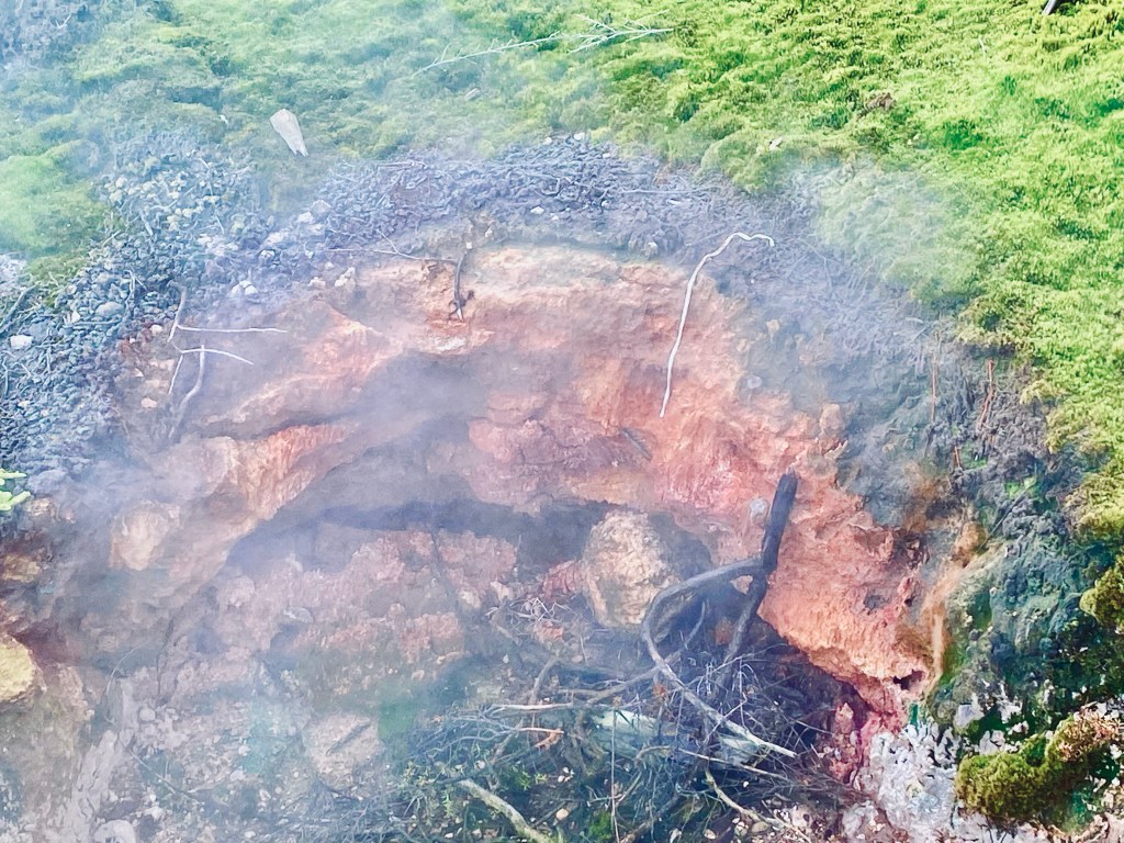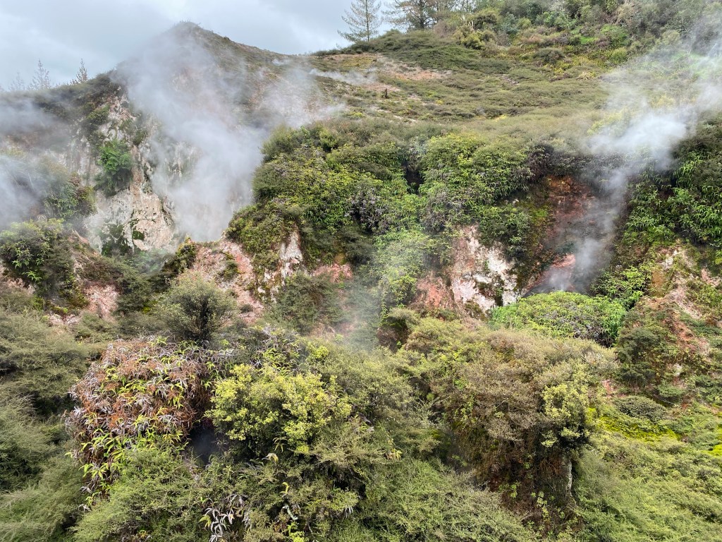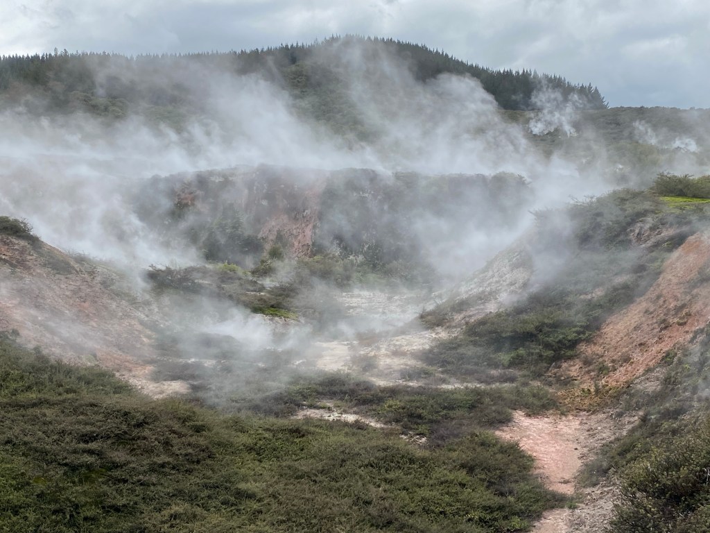 Auf der Fahrt ins Tongariro-Gebiet kann man noch mehr Vulkane erleben. Am besten, man fährt einfach den braunen Hinweisschildern links und rechts der Straße nach. Bei uns waren einige Geysirgebiete auch gesperrt. Es hatte einen kleineren Ausbruch auf Whakaari Island gegeben. Dann geraten auch die heißen Quellen und Geysire in der Mitte der Nordinsel in Unruhe. „Alles hängt zusammen…“ hat der Guide in Whakarewarewa gesagt, und damit nicht nur die Vulkane gemeint.